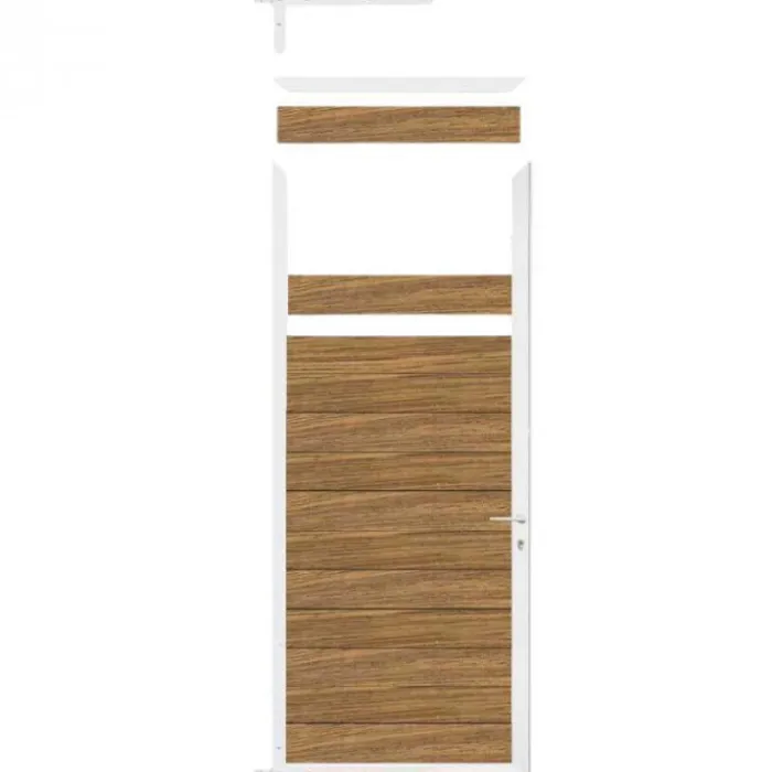 C-Wood zelfbouw tuinpoort Mix & Match wit aluminium frame met hardhout Thermo Fraké lamellen. Afmeting 90 x 200 cm. De netto hoogte van deze tuinpoort is enkele centimeters lager dan de opgegeven 200 cm. De poort wordt geleverd inclusief deurbeslag.
