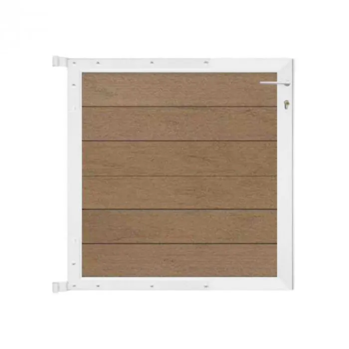 C-Wood zelfbouw tuinpoort Mix & Match antraciet aluminium frame met composiet bruin gevlamd lamellen. Afmeting 90 x 90 cm). De netto hoogte van deze tuinpoort is enkele centimeters lager dan de opgegeven 90 cm. De poort wordt geleverd inclusief deurbeslag.
