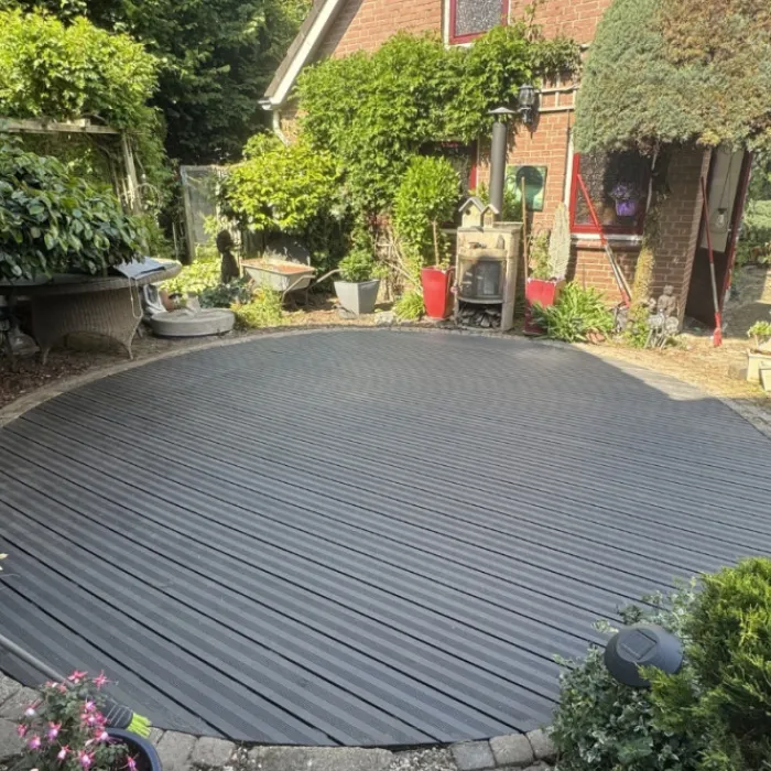 Vlonder totaalpakket voor 1,00 m2, gelegd met antraciet composiet vlonderplanken van 400 cm lang, 2,1 cm hoog en 14,0 cm breed. Pakket bestaat uit vlonderplanken, onderbalken, clips en schroeven om een vlonderterras van te maken. De bijbehorende clips en de kop van de schroef zijn in dezelfde kleur. Vul het benodigd aantal vierkante meter terras in en de website rekent automatisch uit hoeveel planken je ontvangt.