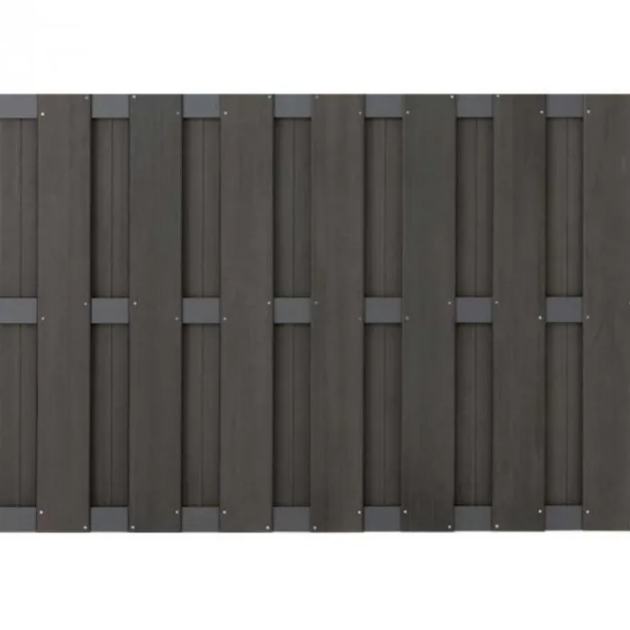 Zelfbouw tuinscherm Bari antraciet met antraciet aluminium frame. Met dit pakket maak je een Bari schutting met een hoogte van 123 cm en een breedte van 180 cm. De dikte van het scherm is 2,9 cm. Per schutting heb je 6 x het T-beslag nodig om deze aan een paal te bevestigen.
