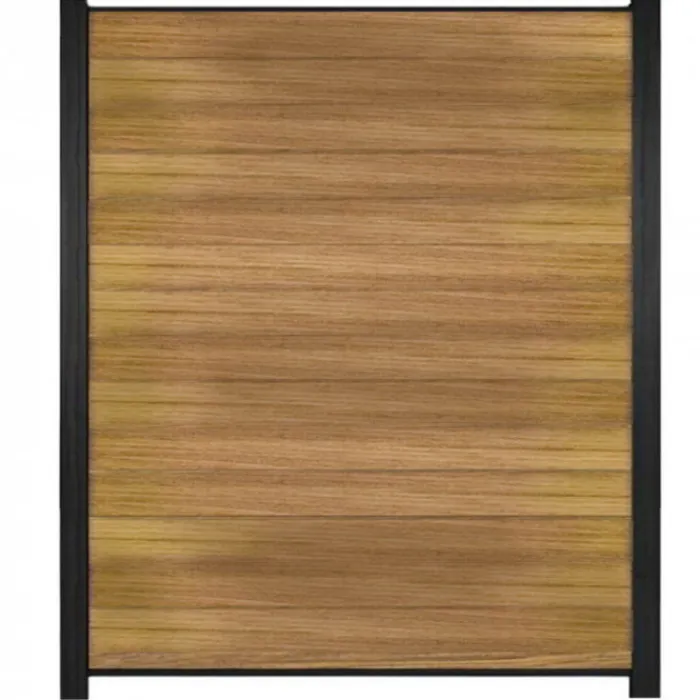 C-Wood zelfbouw schutting hardhout Mix & Match Ipé met zwart aluminium accessoires. Afmeting is 180 x 200 cm. De schuttingdelen schuif je van bovenaf tussen de C-Wood Modular / Mix & Match palen. De volgorde van de verschillende planken kan je zelf bepalen. Je begint onder en eindigt bovenop. De netto hoogte van deze schutting is enkele centimeters lager dan de opgegeven 200 cm.