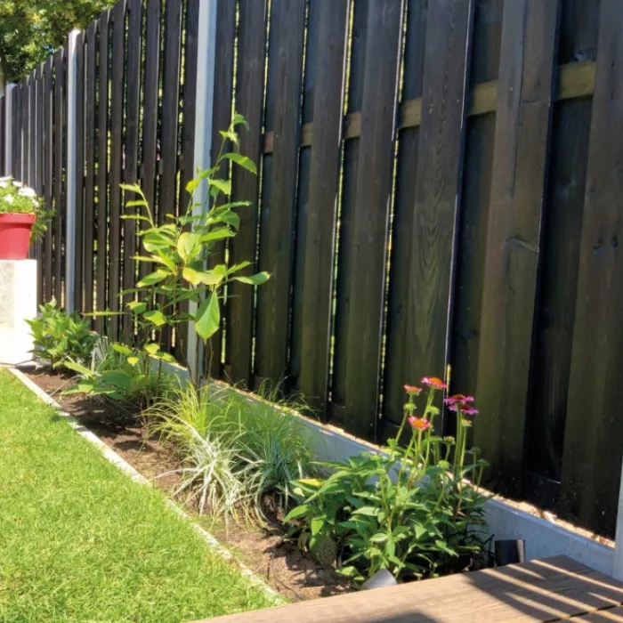 Vuren Finch scherm recht, 180 x 180 x 4,5 cm. Het zwart geverfde scherm bestaat uit 15 planken (8 planken voor, 7 planken achter) en is voorzien van 3 liggers. Voorzien van RVS schroeven om roesten te voorkomen.