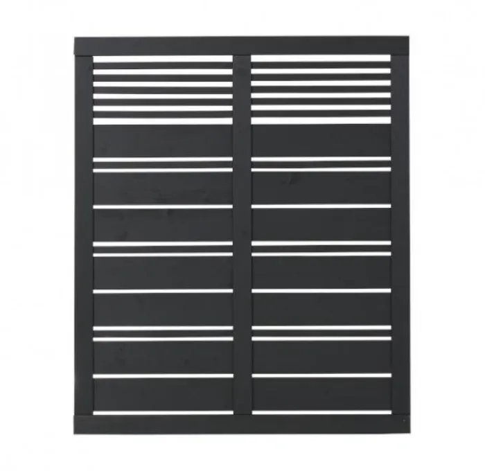 Plus tuinscherm recht vuren geïmpregneerd en zwart afgelakt uit de serie Silence. De afmetingen van dit scherm zijn 120 x 140 (b x h). RVS geschroefd.
