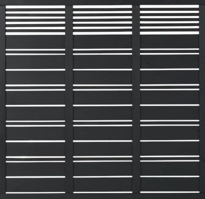 Plus tuinscherm recht vuren geïmpregneerd en zwart afgelakt uit de serie Silence. De afmetingen van dit scherm zijn 176 x 170 (b x h). RVS geschroefd.