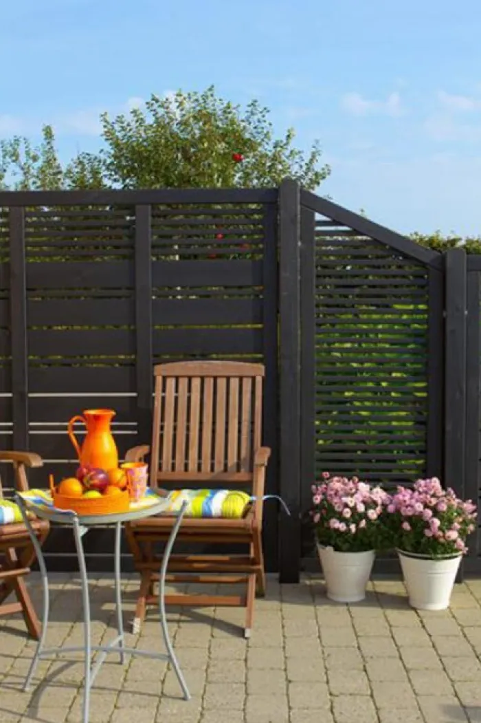 Silence is de naam van een van Plus mooiste serie design schuttingen. Het combineert de rustieke landelijke charme met een eenvoudige uitstraling. De tuinschermen bestaan uit horizontale planken waar een kleine ruimte open is tussen de schuttingplanken. De schuttingen zijn verkrijgbaar in verschillende maten en kleuren. Zo kan je kiezen voor de kleur antraciet, grijsbruin of zwart. Daarmee geef je een terras of tuin een moderne uitstraling. Wil je liever een sfeer die romantisch is? Kies dan voor de landelijke uitstraling die teak of groen geïmpregneerd van kleur is. Voor een Beach House sfeer kies je voor de witte uitvoering.