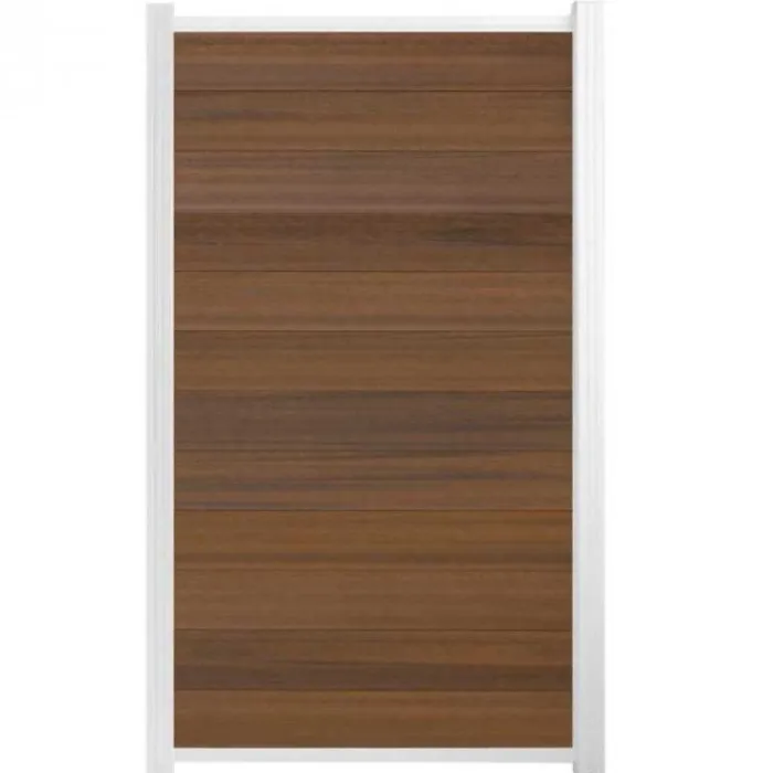Schutting composiet co-extrusie Garda teak met wit aluminium kader (90 x 180 cm). Deze schutting wordt geleverd als een zelfbouw pakket waarmee je zelf een unieke schutting kunt maken.