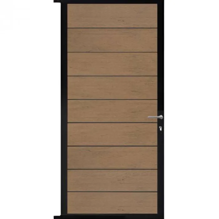 C-Wood zelfbouw tuindeur aluminium zwart frame Modular – composiet bruin gevlamd. Afmeting 90 x 200 cm. De hoogte van de tuindeur is enkele centimeters lager dan de opgegeven 200 cm. De tuindeur wordt geleverd inclusief deurbeslag.