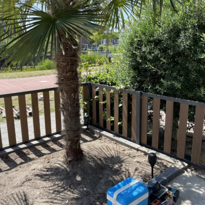 C-wood tuinhek bruin gevlamd composiet Design met antraciet aluminium frame (180 x 80 cm). Stevig en zeer onderhoudsvriendelijk tuinhek gemaakt van antraciet aluminium dwarsliggers met daartussen 10 composietplanken in de kleur bruin gevlamd.