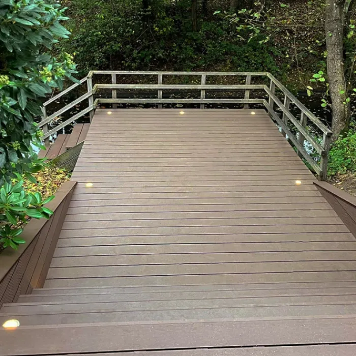 Vlonder totaalpakket voor 1,00 m2, gelegd met donker bruine composiet vlonderplanken van 300 cm lang, 2,1 cm hoog en 14,0 cm breed. Pakket bestaat uit vlonderplanken, onderbalken, clips en schroeven om een vlonderterras van te maken. De bijbehorende clips en de kop van de schroef zijn in dezelfde kleur. Vul het benodigd aantal vierkante meter terras in en de website rekent automatisch uit hoeveel planken je ontvangt.