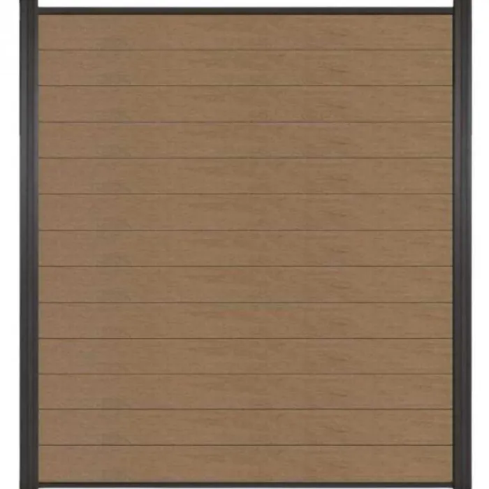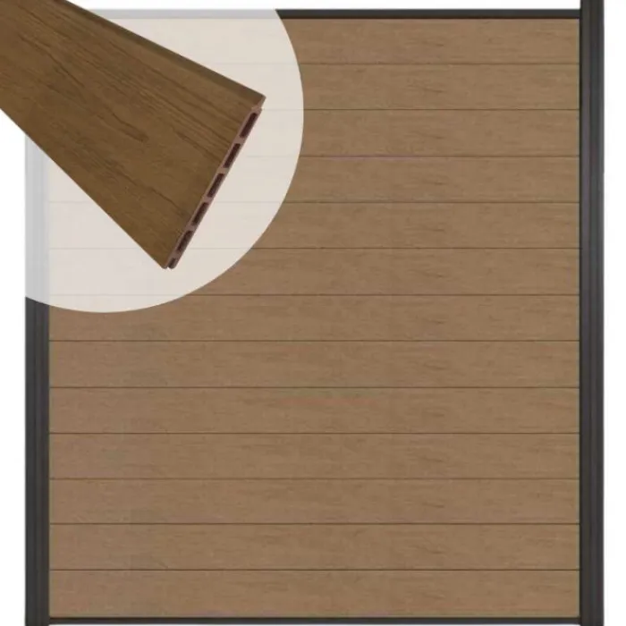 C-Wood zelfbouw schutting composiet Mix & Match bruinvlam met antraciet aluminium accessoires. Afmeting is 180 x 200 cm. De schuttingdelen schuif je van bovenaf tussen de C-Wood Modular / Mix & Match palen. De volgorde van de verschillende planken kan je zelf bepalen. Je begint onder en eindigt bovenop. De netto hoogte van deze schutting is enkele centimeters lager dan de opgegeven 200 cm.