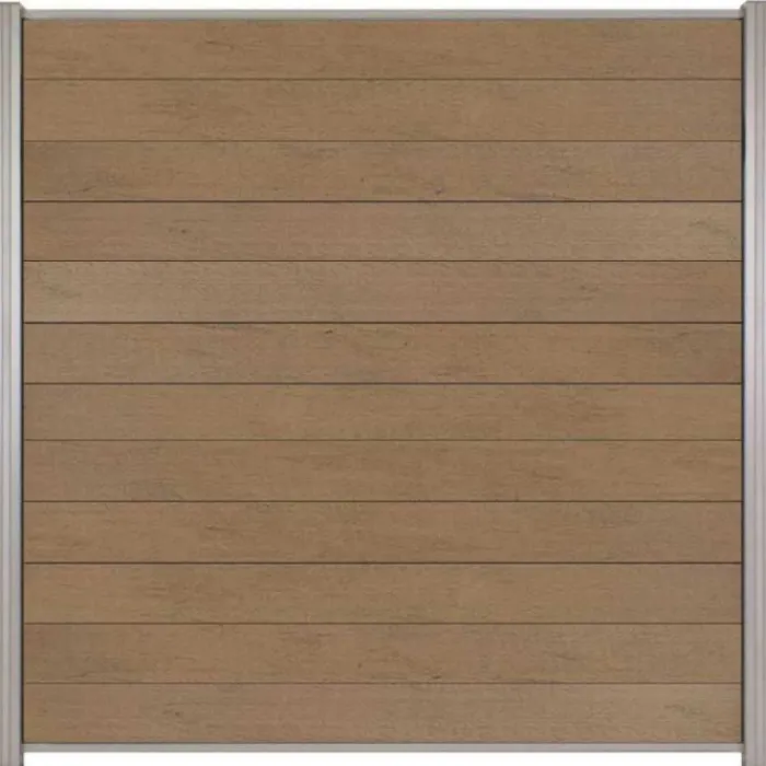 C-Wood zelfbouw schutting composiet Mix & Match bruinvlam met blank aluminium accessoires. Afmeting is 180 x 180 cm. De schuttingdelen schuif je van bovenaf tussen de C-Wood Modular / Mix & Match palen. De volgorde van de verschillende planken kan je zelf bepalen. Je begint onder en eindigt bovenop. De netto hoogte van deze schutting is enkele centimeters lager dan de opgegeven 180 cm.