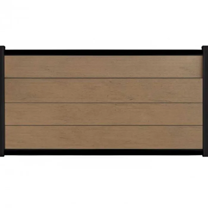C-Wood zelfbouw schutting composiet Modular bruin gevlamd met zwart aluminium accessoires. Geschikt om een scherm te maken van 97 cm hoog en maximaal 180 cm breed. De breedte is eenvoudig in te korten.