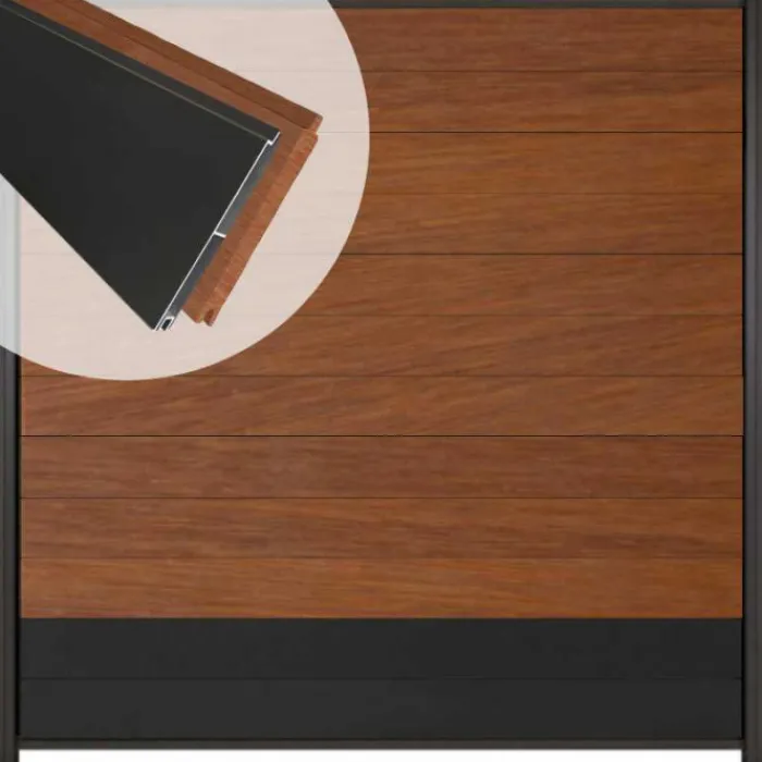 C-Wood zelfbouw schutting hardhout Mix & Match Bamboe / antraciet met antraciet aluminium accessoires. Afmeting is 180 x 180 cm. De schuttingdelen schuif je van bovenaf tussen de C-Wood Modular / Mix & Match palen. De volgorde van de verschillende planken kan je zelf bepalen. Je begint onder en eindigt bovenop. De netto hoogte van deze schutting is enkele centimeters lager dan de opgegeven 180 cm.