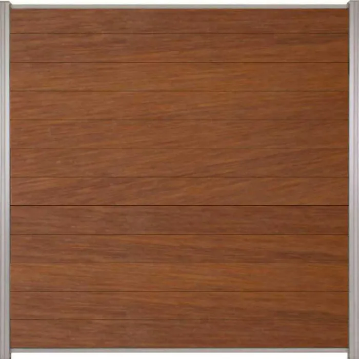 C-Wood zelfbouw schutting hardhout Mix & Match Bamboe met blank aluminium accessoires. Afmeting is 180 x 180 cm. De schuttingdelen schuif je van bovenaf tussen de C-Wood Modular / Mix & Match palen. De volgorde van de verschillende planken kan je zelf bepalen. Je begint onder en eindigt bovenop. De netto hoogte van deze schutting is enkele centimeters lager dan de opgegeven 180 cm.