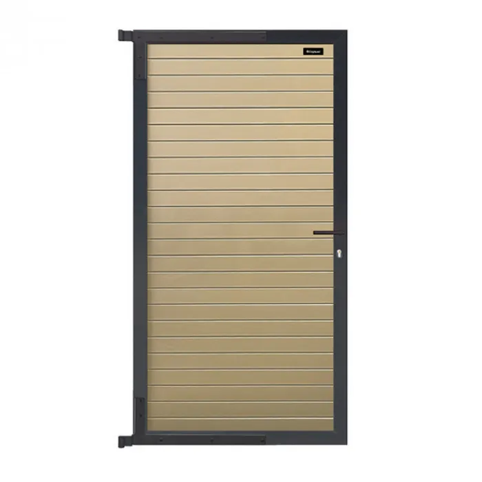Elephant tuindeur dark line aluminium Rhombus zandkleur (90x180cm) incl. beslag. Deze deur bestaat uit 24 antraciet gepoedercoate lamellen en wordt geleverd met hengen, deurkrukken, cilinderslot en deurstopper. De deur past bij de dark line Rhombus tuinschermen.