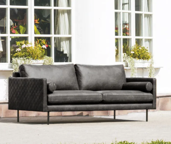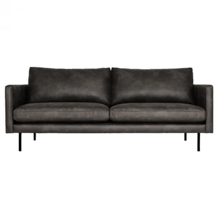 Deze stoere 3 zitsbank uit de Daisy serie heeft bewerkte armleuningen met gestikt ruitpatroon. De smalle hoge poten zijn van zwart metaal. Doordat de bank zo hoog op zijn poten staat, creëer je een ruimtelijk effect en houd je het interieur luchtig. De perfect bank dus voor wanneer de kamer niet zo groot is. De bank is in een gerecyclede leersoort bekleed in de kleur antraciet.