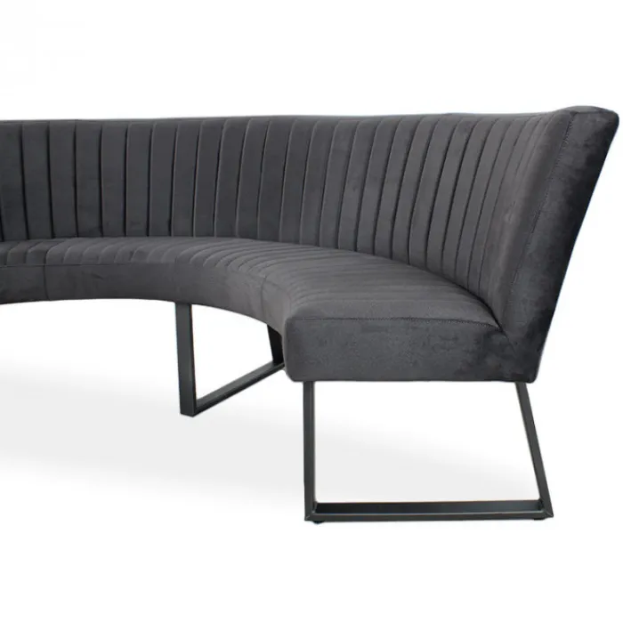 HomingXL ronde eetkamerbank geschikt voor een ronde tafel met een diameter van 150 cm. Deze stoere halfronde eetkamerbank Hengelo is gestoffeerd met de prachtige Element velours stof in de kleur antraciet. De bank is uitgevoerd met zwarte metalen poten. Deze eetkamerbank heeft een stoere uitstraling en is zowel geschikt voor een industrieel als een modern interieur.
