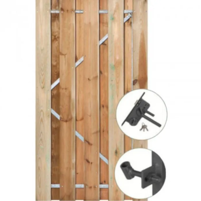 HomingXL Tuindeur met ijzeren frame 100 x 195 cm inclusief zwart beslag. Het frame is voorzien van grenen, geschaafde en geïmpregneerde planken. De planken zijn 14 cm breed, 1,6 cm dik en de totale hoogte is 195 cm. Je kunt de hoogte inkorten door de planken af te zagen.