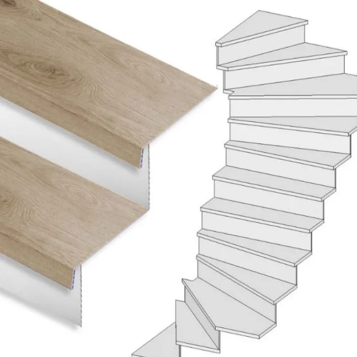 Dit is een complete Stepwoord traprenovatieset met SPC toplaag traptreden in de kleur natuur eiken (bruin) en witte stootborden, inclusief montagekit en afwerkingskit. Deze complete set is geschikt voor een trap met 2 kwart draai met 16 treden. De set wordt geleverd inclusief witte stootborden, omdat het een set voor een dichte trap betreft.