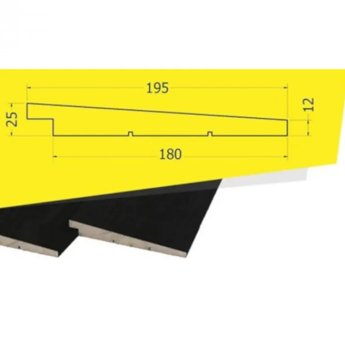 Trendhout Zweeds rabat Europees naaldhout rondom zwart gespoten 1,2/2,5 x 19,5 cm gezaagd (4,00 mtr). Deze plank is gezaagd, dat wil zeggen dat de oppervlakte ruw is en splinters bevat. De plank is 2x rondom zwart gespoten. Zichtzijde is fijn bezaagd, werkende breedte is 18 cm. De aangegeven afmetingen zijn nominale maten en kunnen een afwijking hebben tot maximaal 5 mm.
