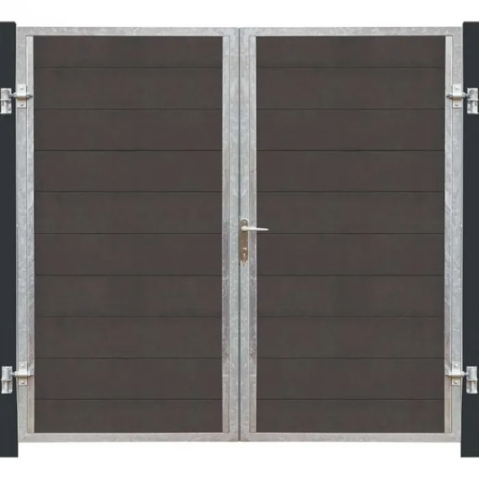 De antraciet kleurige dubbele tuindeur met stalen frame heeft lamellen gemaakt van composiet. De dubbele tuindeur is makkelijk schoon te maken. Het frame is gemaakt van thermisch verzinkt staal. De dubbele tuindeur heeft een afmeting van 99 x 180 cm. De zwart/grijze palen worden meegeleverd. Hierdoor komt je uit op een afmeting van 213 x 180 cm (2x 16 cm palen). De deur gaat naar rechts open.