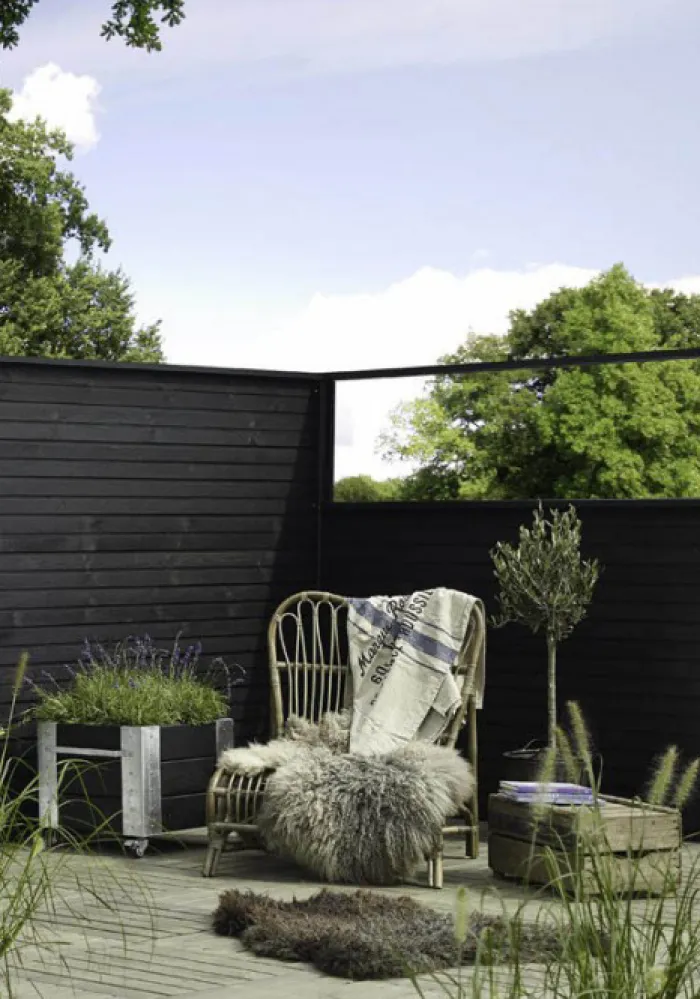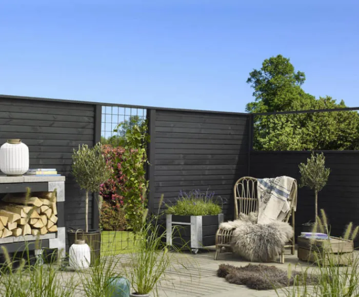 Plus Danmark tuinscherm recht vuren geïmpregneerd zwart uit de serie Plus Plank. Set van planken (25 x 145 mm).