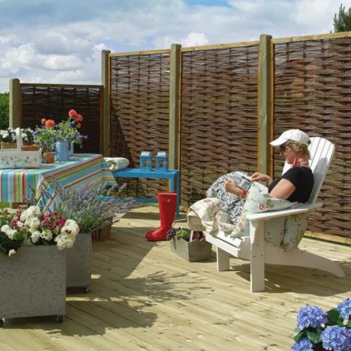 Plus Danmark tuinscherm gevlochten Wilgen 120 x 100 cm (B x H). Frame bruin gebeitst naaldhout 24 x 48 mm. Wilgen zijn voorbehandeld met schimmelwerend middel en olie.