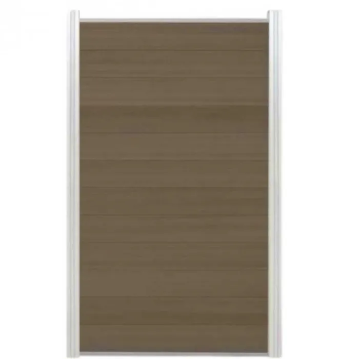 Schutting composiet co-extrusie Garda vergrijsd bruin met blank aluminium kader (90 x 180 cm). Deze schutting wordt geleverd als een zelfbouw pakket waarmee je zelf een unieke schutting kunt maken.