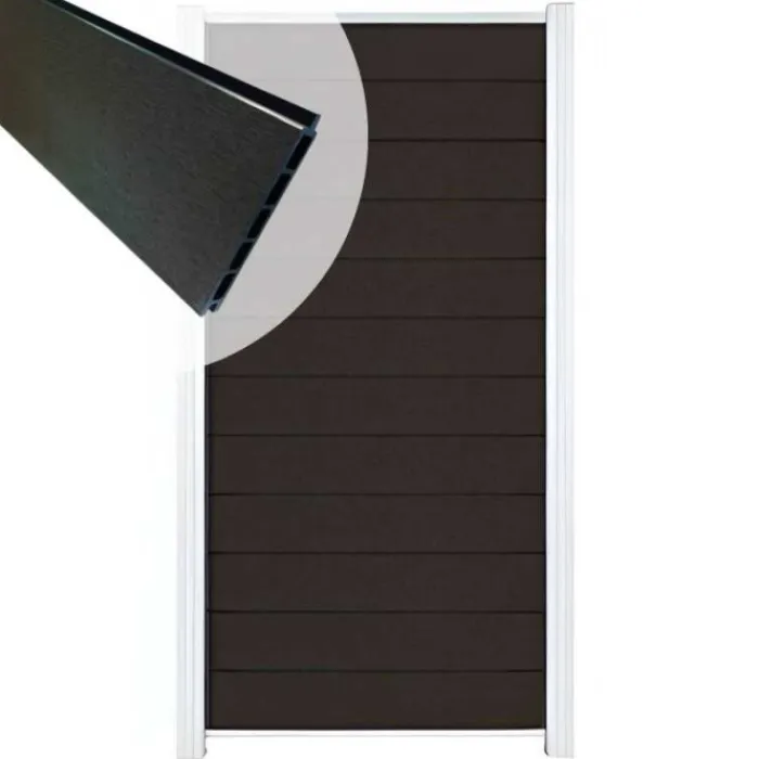 C-Wood zelfbouw schutting composiet Mix & Match antraciet met wit aluminium accessoires. Afmeting is 90 x 180 cm De schuttingdelen schuif je van bovenaf tussen de C-Wood Modular / Mix & Match palen. De volgorde van de verschillende planken kan je zelf bepalen. Je begint onder en eindigt bovenop. De netto hoogte van deze schutting is enkele centimeters lager dan de opgegeven 180 cm. De onderdelen dien je in de breedte in te korten om tot 90 cm breed te komen.