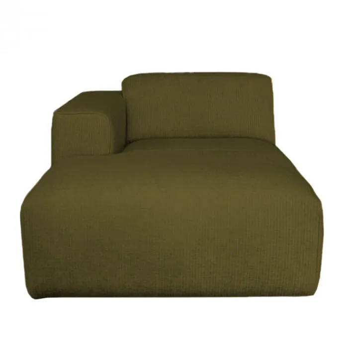 De loungebank bestaat uit losse modules: een open eind en een lounge element. De modules zijn bekleed met de stof Rackham in de kleur groen.