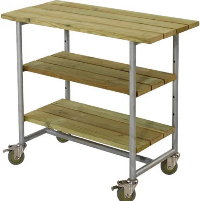 Plus Danmark Bijzettafel vuren Urban met twee planken geïmpregneerd hout. Afmeting 50 x 100 x 90 cm (B x L x H). Buizen Ø33,7 mm. Planken 28 x 120 mm. Voorzien van 2 vaste wielen en 2 zwenkwielen. Bouwpakket, deels voorgemonteerd, zelf in elkaar zetten.