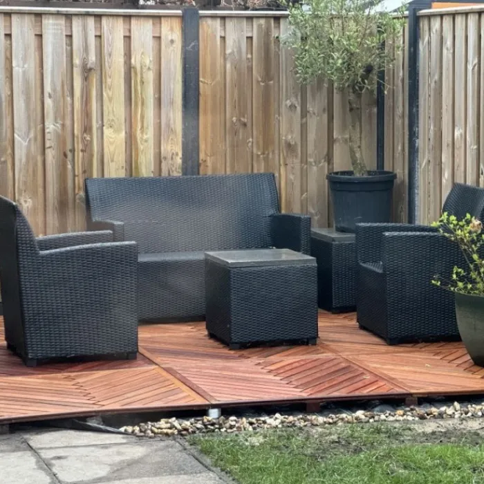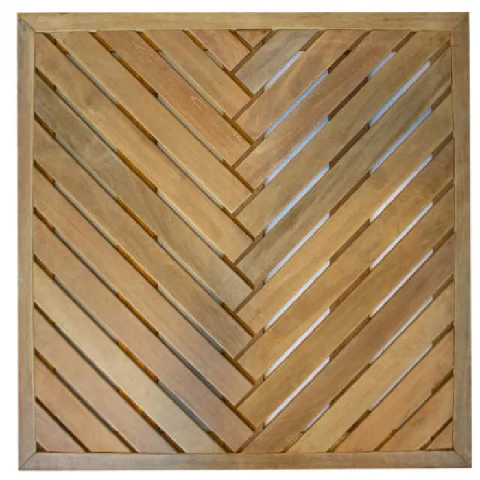 Smaragd terrastegel hardhout Bankirai. Visgraat motief, deze tegel is 24 mm dik en heeft een afmeting van 100 x 100 cm. Het oppervlak is vlak geschaafd.