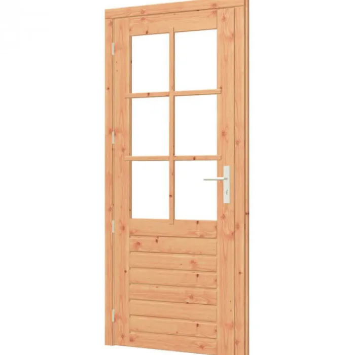 Trendhout enkele deur met kozijn – linksdraaiend – 830 x 2060 mm – borstwering 812 mm. Kozijn 964 x 2136 mm. Douglas stapeldorpeldeur linksdraaiend enkel met kozijn, borstwering 81,2 cm. Inclusief losse voorzetroede, enkel glas en hang- en sluitwerk