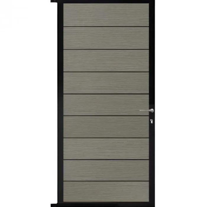 C-Wood zelfbouw tuindeur aluminium zwart frame Modular – composiet co-ex grijs. Afmeting 90 x 200 cm. De hoogte van de tuindeur is enkele centimeters lager dan de opgegeven 200 cm. De tuindeur wordt geleverd inclusief deurbeslag.