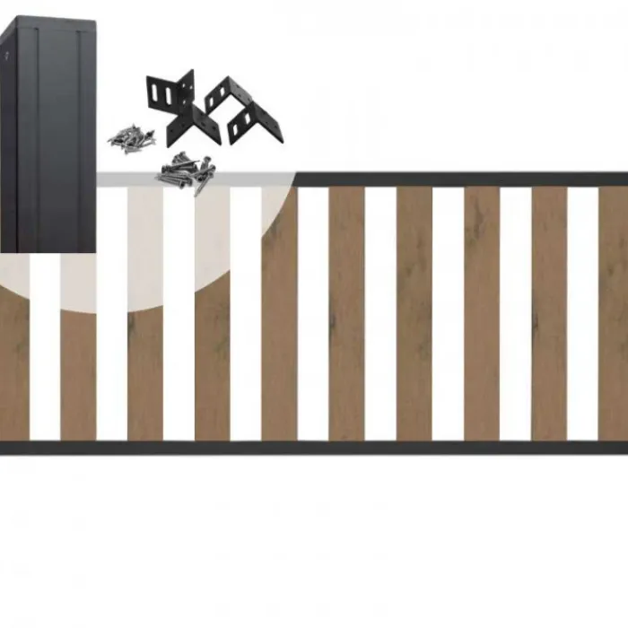 C-wood compleet tuinhek set bruin gevlamd composiet Design met antraciet aluminium frame. Stevig en zeer onderhoudsvriendelijk tuinhek gemaakt van antraciet aluminium dwarsliggers met daartussen 10 composietplanken in de kleur bruin gevlamd.