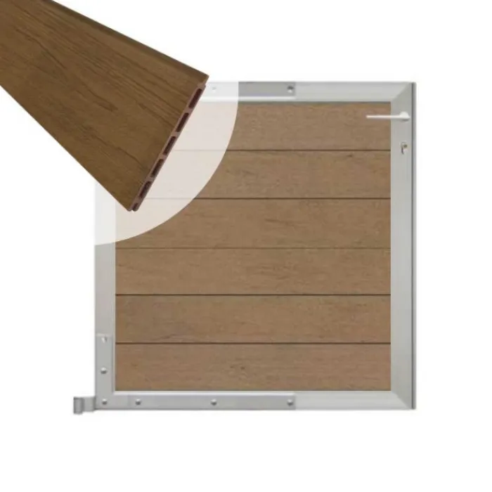 C-Wood zelfbouw tuinpoort Mix & Match antraciet aluminium frame met composiet bruin gevlamd lamellen. Afmeting 90 x 90 cm). De netto hoogte van deze tuinpoort is enkele centimeters lager dan de opgegeven 90 cm. De poort wordt geleverd inclusief deurbeslag.