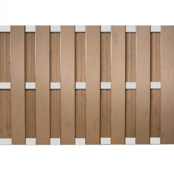 Zelfbouw tuinscherm Bari bruin gevlamd met blank aluminium frame. Met dit pakket maak je een Bari schutting met een hoogte van 123 cm en een breedte van 180 cm. De dikte van het scherm is 2,9 cm. Per schutting heb je 6 x het T-beslag nodig om deze aan een paal te bevestigen.
