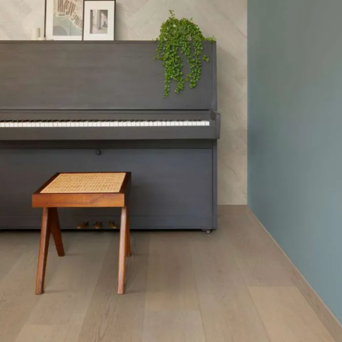 Eerst een duurzame geïntegreerde kurkonderlaag met daarop een akoestische geluiddempende laag. Vervolgens de comfort- en stijlvolle laag die niet te onderscheiden zijn van echt hout en tot slot een hoogwaardige slijtlaag van 0.55 mm dik.