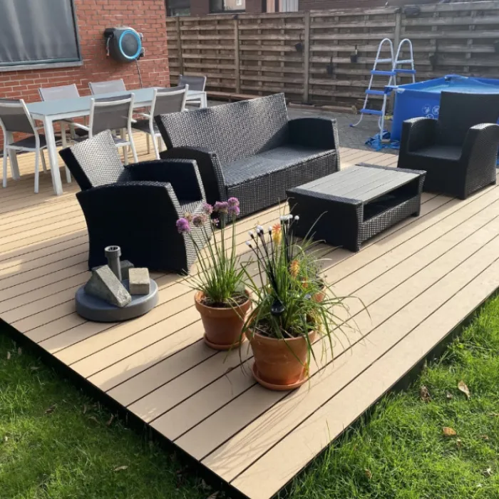 Vlonder totaalpakket voor 1,00 m2, gelegd met teak bruin composiet vlonderplanken van 300 cm lang, 2,1 cm hoog en 14,0 cm breed. Pakket bestaat uit vlonderplanken, onderbalken, clips en schroeven om een vlonderterras van te maken. Vul het benodigd aantal vierkante meter terras in en de website rekent automatisch uit hoeveel planken je ontvangt.