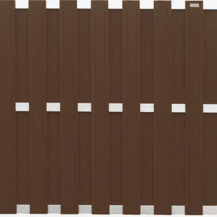 Elephant schutting composiet Design donkerbruin met blank aluminium frame. 180 x 180 cm (b x h). Met FSC keurmerk. De planken hebben een breedte van 14,5 cm.