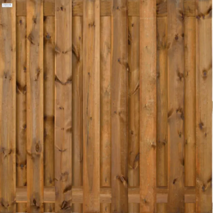 4,7 x 200 x 200 cm. Grenen geïmpregneerd TIMBER scherm. Scherm bestaat uit 15 planken (8 planken voor, 7 planken achter). Bruine kleur blijft zonder oliën/beitsen ongeveer twee jaar behouden.