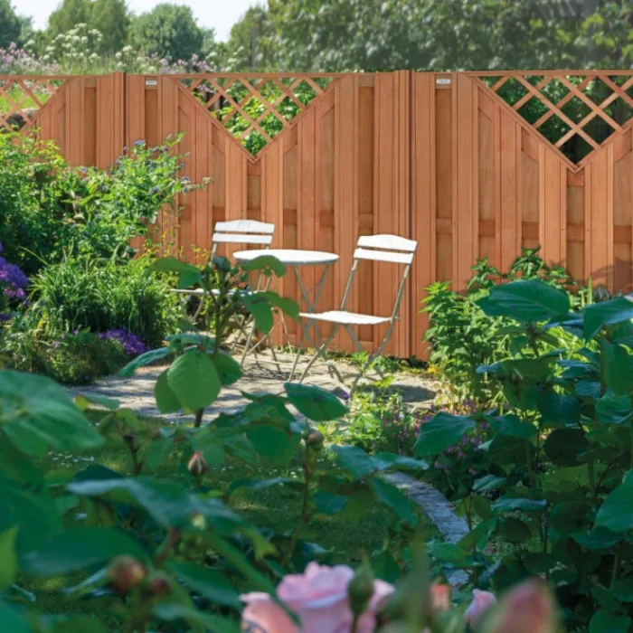 Elephant Schutting hardhout Keruing Timber recht met v- trellis 15L (180 x 180 cm) v-groef schermdikte 3,9 cm. Scherm bestaat uit 15 planken (8 planken voor, 7 planken achter). Voorzien van RVS schroeven om roesten te voorkomen.