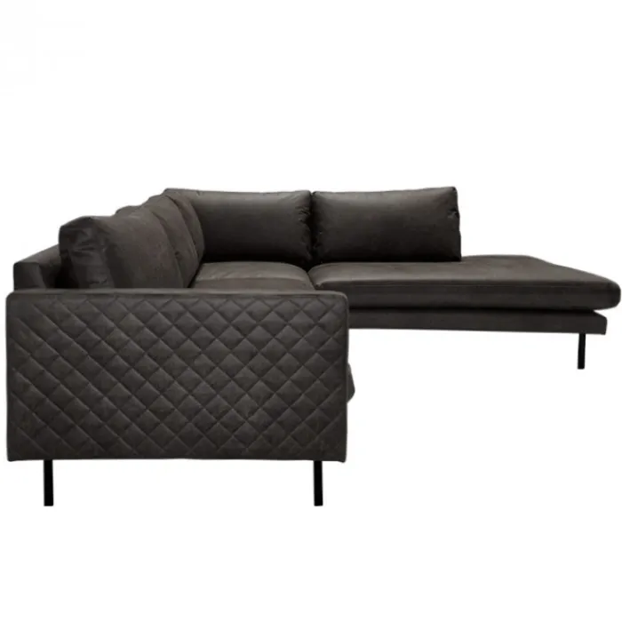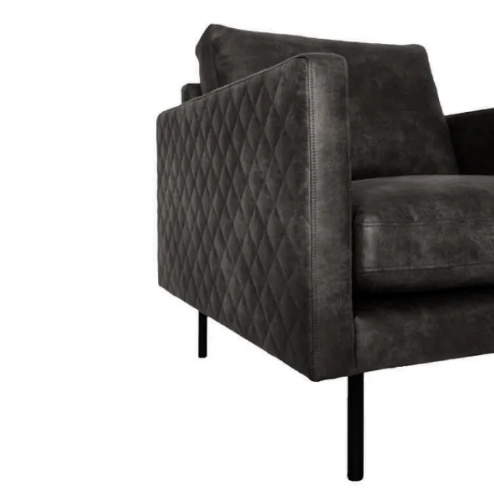 Deze trendy loungebank uit de Daisy serie heeft bewerkte armleuningen met gestikt ruitpatroon en is uitgevoerd in de prachtige leersoort Colorado in de kleur antraciet. De smalle hoge poten zijn van zwart metaal. Doordat de bank zo hoog op zijn poten staat, creëer je een ruimtelijk effect en houd je het interieur luchtig.