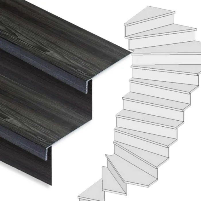 Dit is een complete Stepwoord traprenovatieset met SPC toplaag traptreden en stootborden in de kleur antraciet, inclusief montagekit en afwerkingskit. Deze complete set is geschikt voor een trap met 2 kwart draai met 12 treden. De set wordt geleverd inclusief stootborden, omdat het een set voor een dichte trap betreft.
