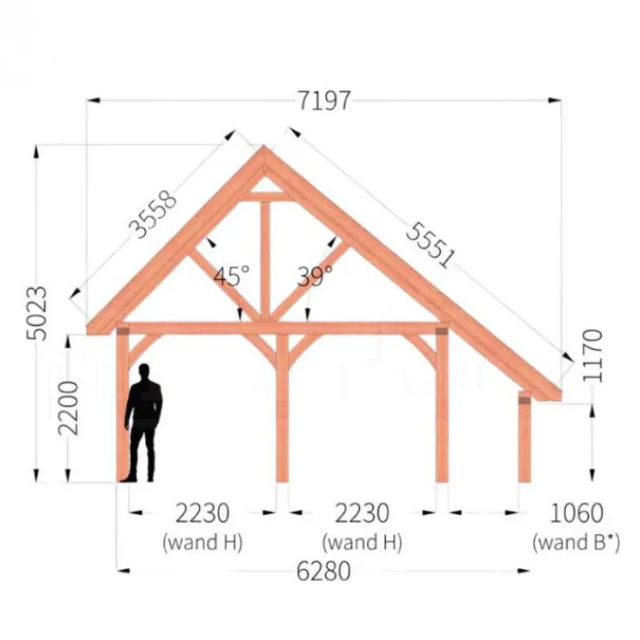 Trendhout Kapschuur De Hofstee XXL. Dit is het basis model van 6 meter diep en beschikbaar in diverse breedte maten. Wil je deze kapschuur helemaal naar eigen wens samen stellen klik dan op de knop hierboven en ontwerp je kapschuur in de 3D configurator.