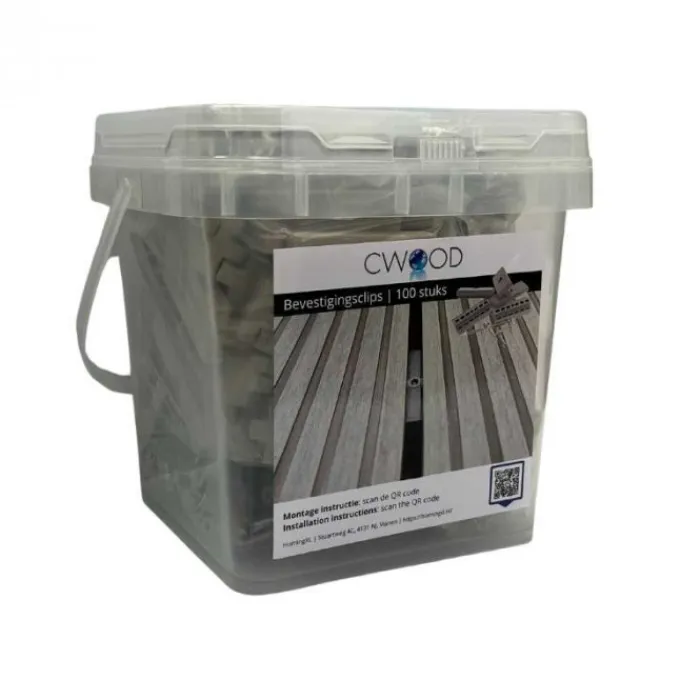 C-Wood bevestigingsclips inclusief RVS schroeven emmer á 100 stuks. Deze kunststof clips zijn er om C-Wood vlonderplanken te monteren aan onderbalken. In de emmer zitten ook nog 15 extra schroeven om eventuele randafwerking vast te schroeven.