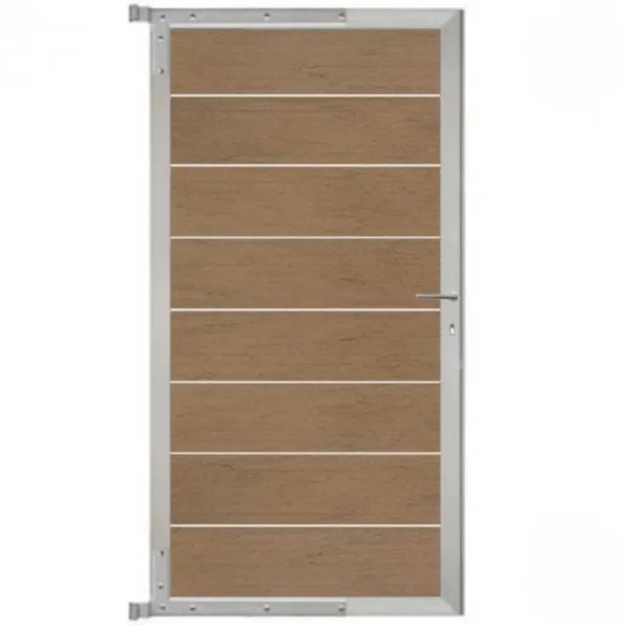 C-Wood zelfbouw tuindeur aluminium blank frame Modular – composiet bruin gevlamd. Afmeting 90 x 180 cm. De hoogte van de tuindeur is enkele centimeters lager dan de opgegeven 180 cm. De tuindeur wordt geleverd inclusief deurbeslag.