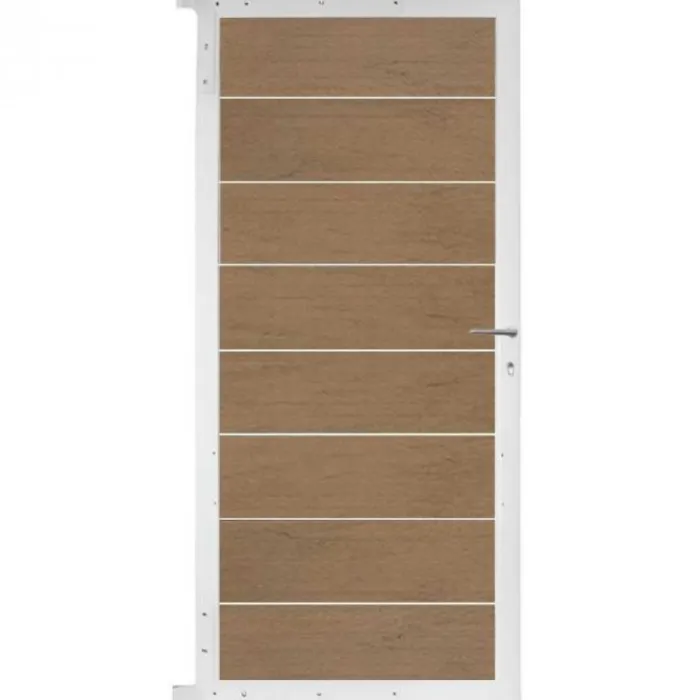 C-Wood zelfbouw tuindeur aluminium wit frame Modular – composiet bruin gevlamd. Afmeting 90 x 180 cm. De hoogte van de tuindeur is enkele centimeters lager dan de opgegeven 180 cm. De tuindeur wordt geleverd inclusief deurbeslag.