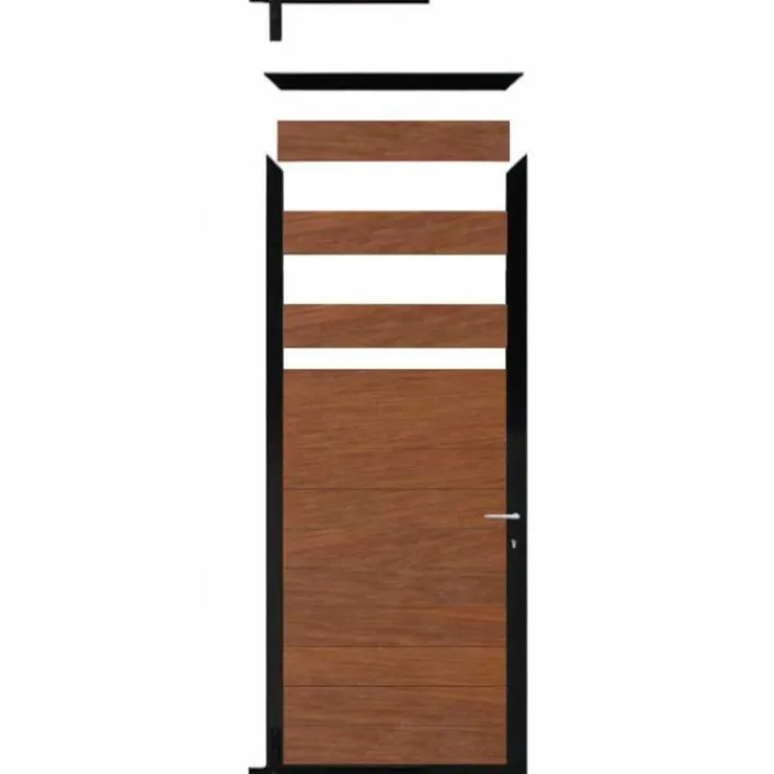 C-Wood zelfbouw tuindeur aluminium zwart frame Mix & Match – hardhout Bamboe (90 x 200 cm). De netto hoogte van deze tuinpoort is enkele centimeters lager dan de opgegeven 200 cm. De poort wordt geleverd inclusief deurbeslag.