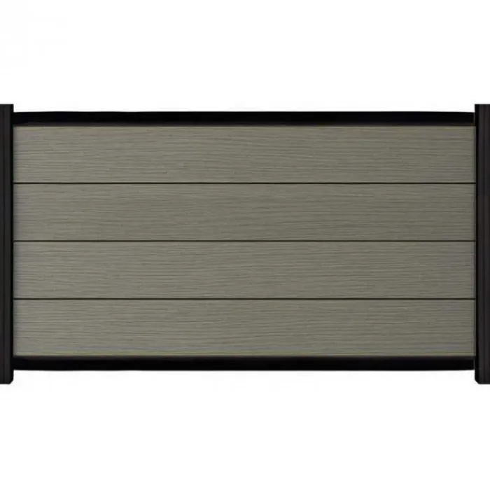 C-Wood zelfbouw schutting composiet Modular co-ex grijs met zwart aluminium accessoires. Geschikt om een scherm te maken van 97 cm hoog en maximaal 180 cm breed. De breedte is eenvoudig in te korten.